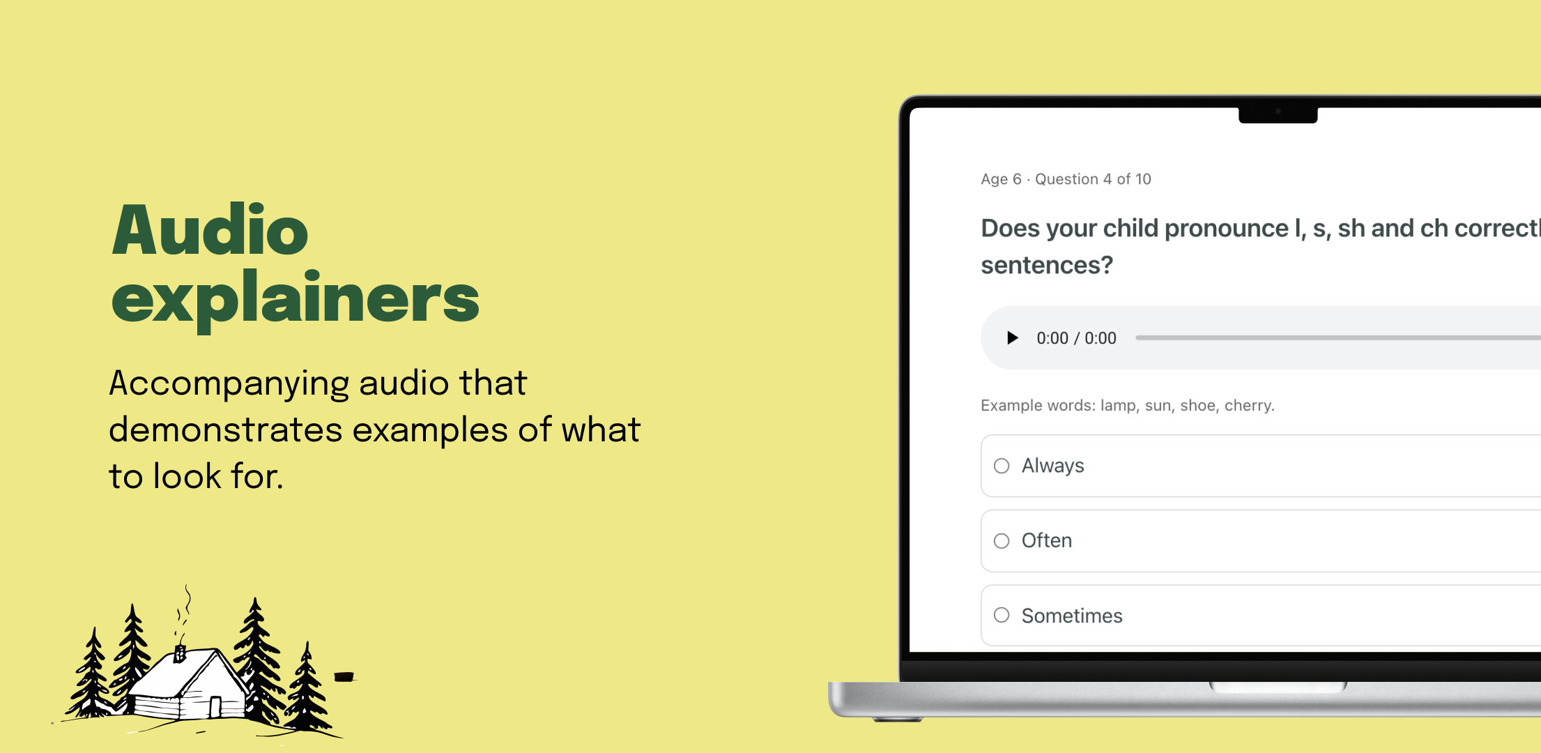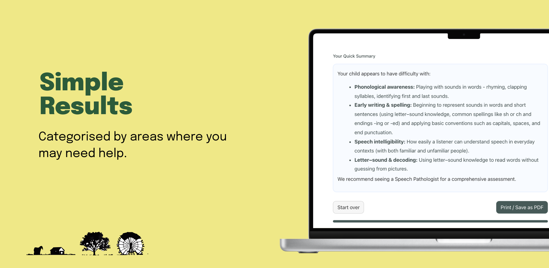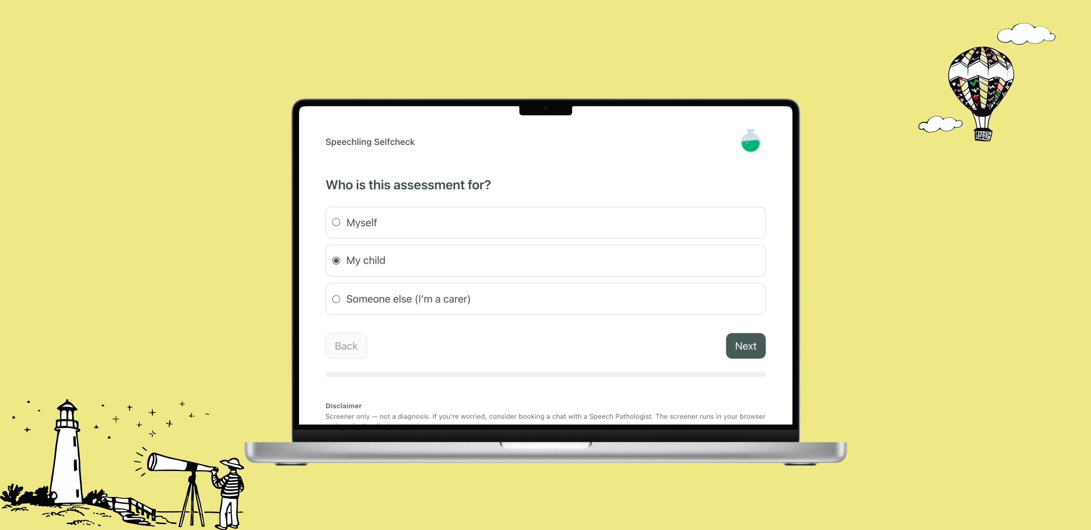 Screener only - not a diagnosis. If you’re worried, consider booking a chat with a Speech Pathologist. The screener runs in your browser and we don’t collect or store your answers. © 2026 Speechling. All rights reserved. Please don’t reuse without permission.